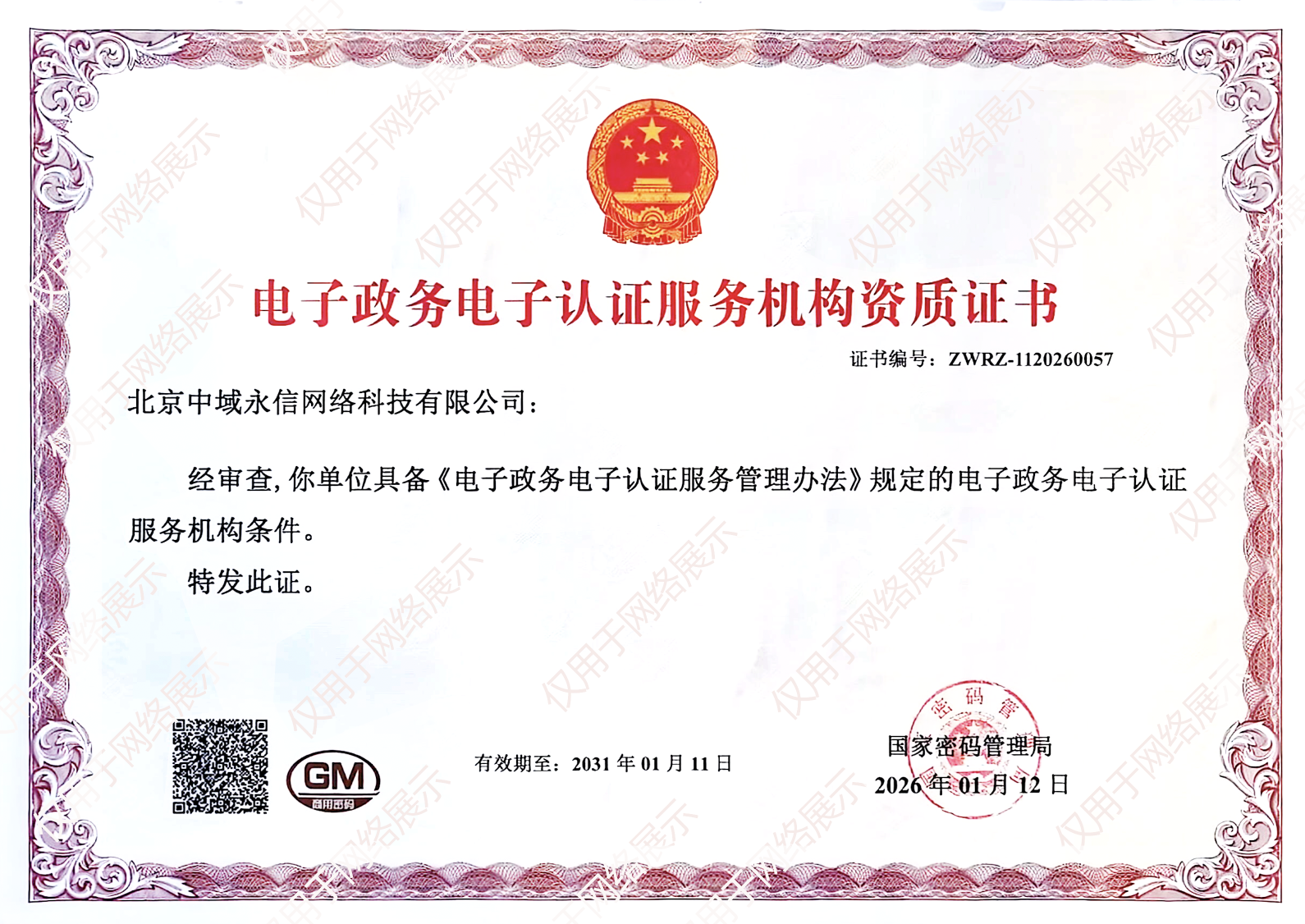 中域永信集团成立于2013年,是一家专注于为企事业单位提供网站安全加密、网站认证、电子签章、网络综合服务的高新技术企业,已经获得国家密码局颁发的《电子认证服务使用密码许可证》(证书编号0073)和《电子政务电子认证服务机构资质证书》(证书编号A057),并荣膺北京市“专精特新”中小企业,总部位于北京,同时在天津、郑州、石家庄、深圳设立了四家子公司,服务范围覆盖全国,累计服务客户超12万家。已通过ISO9001质量管理体系认证、ISO/IEC 20000-1信息技术服务管理体系认证和ISO/IEC 27001信息安全管理体系认证。